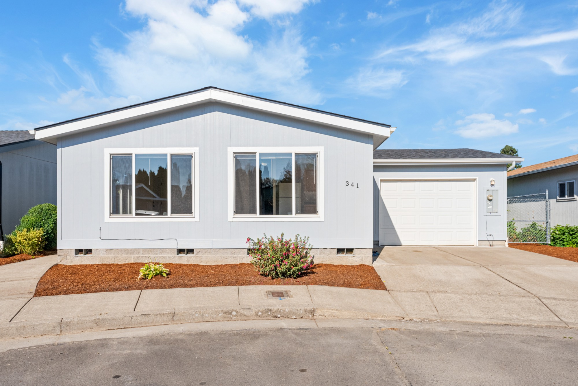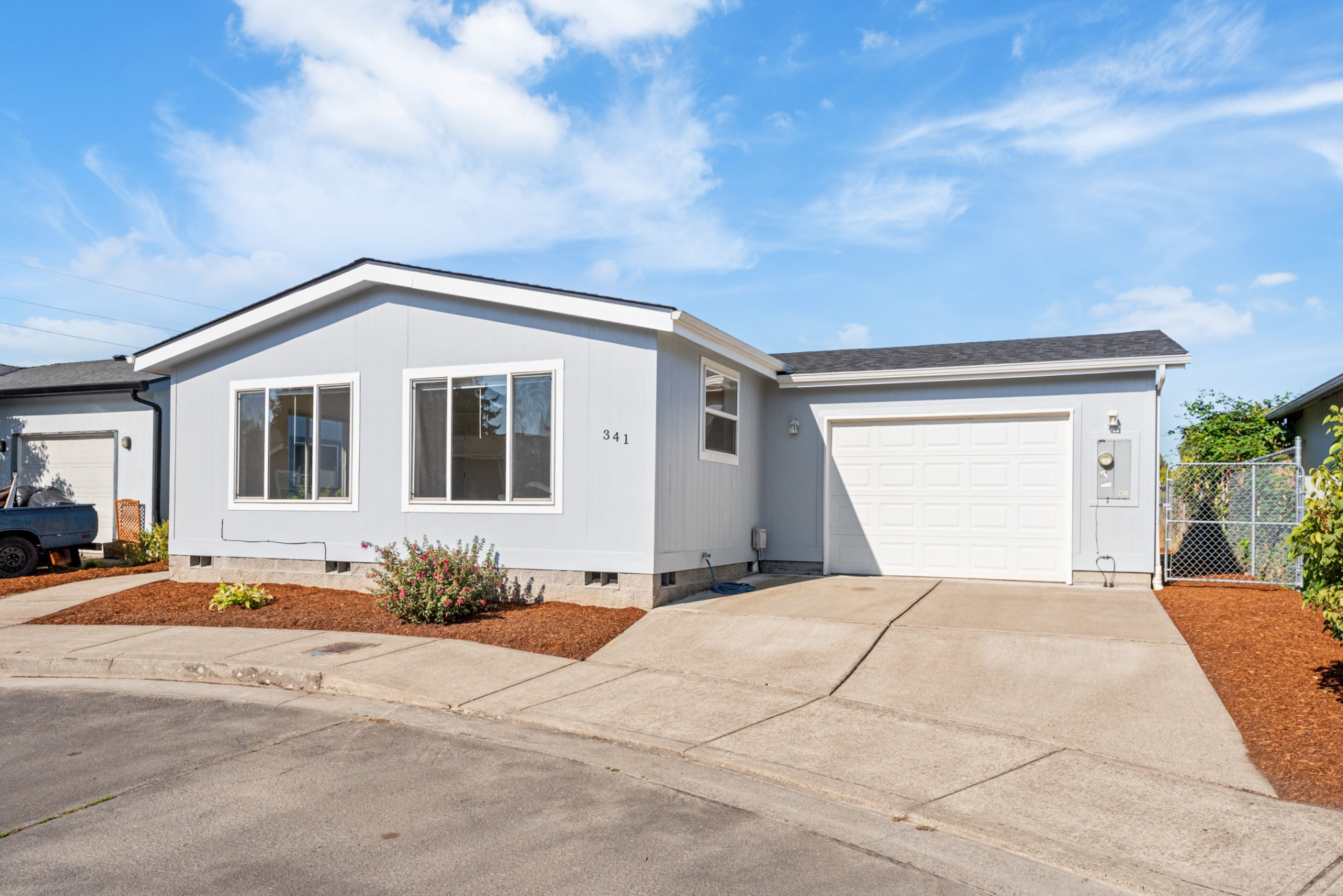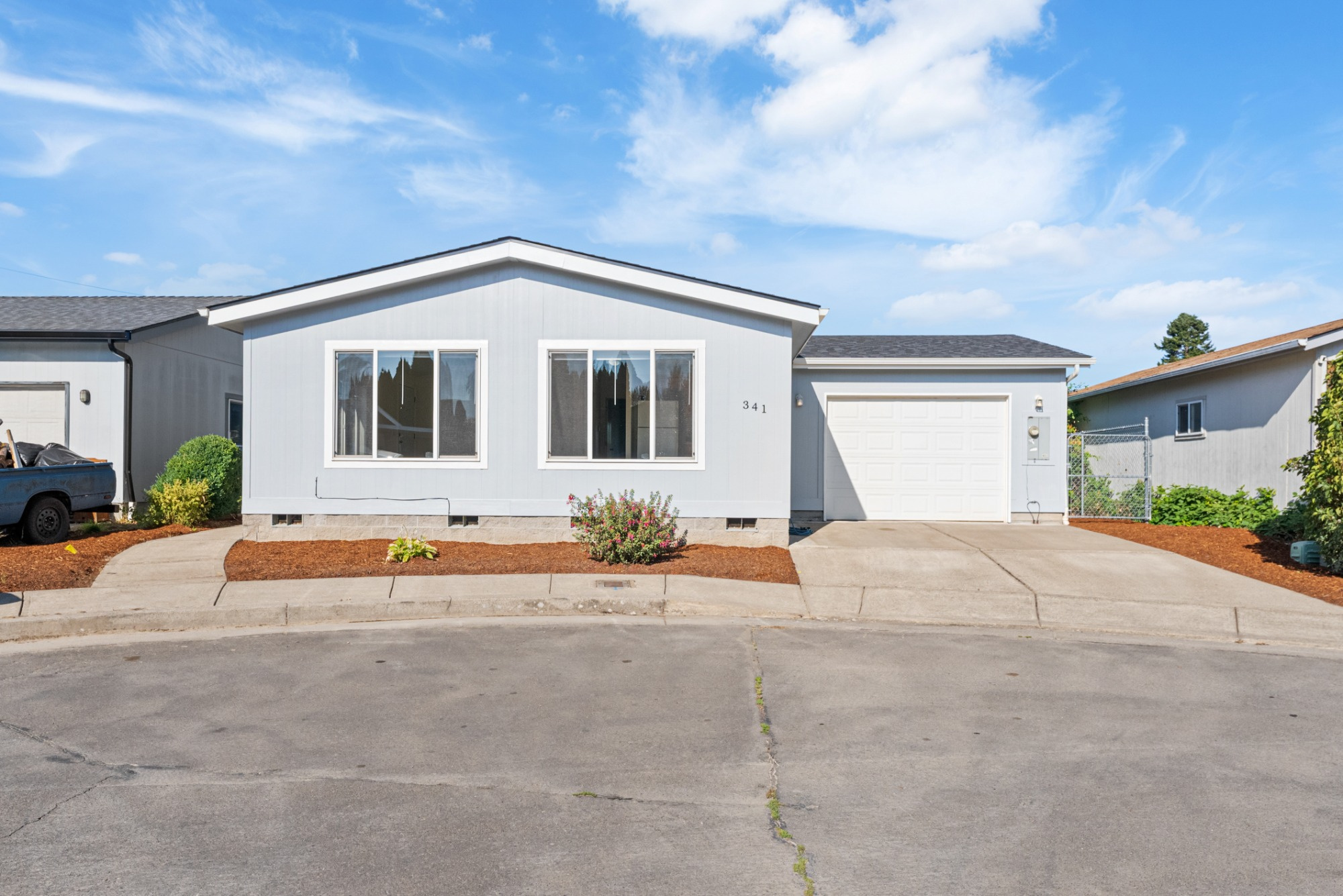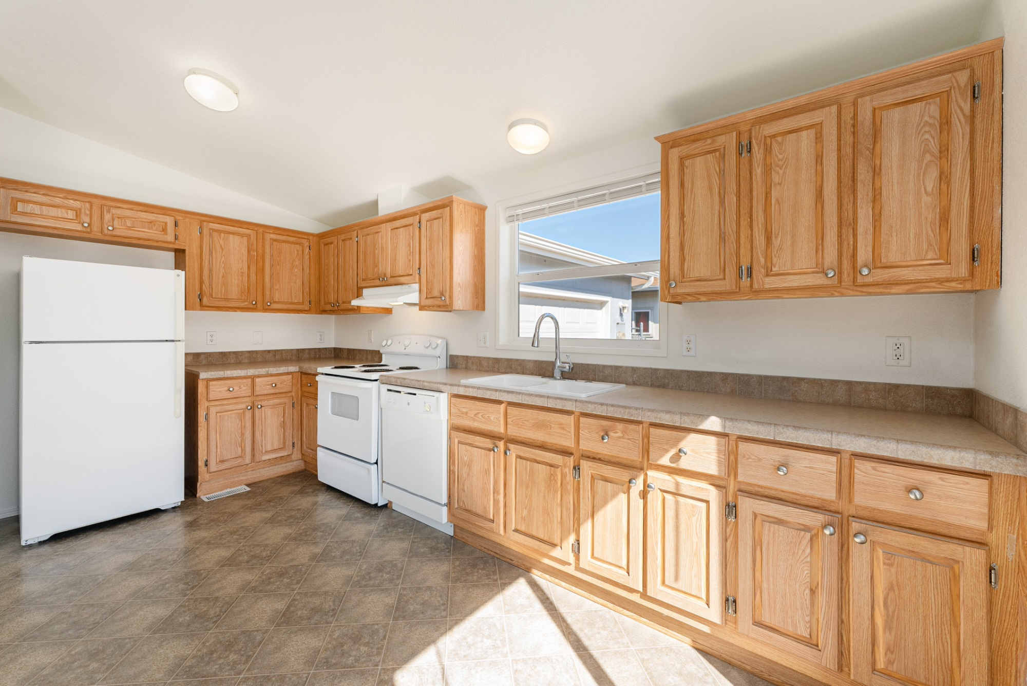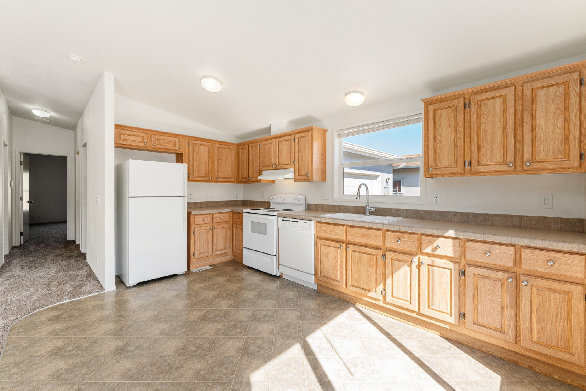 Welcome to easy living! This move-in ready, single-level home sits on a quiet cul-de-sac with a brand new roof and offers a comfortable, low-maintenance lifestyle on land you own. Inside, the great room layout with vaulted ceilings creates an open and airy feel, blending the living, dining, and kitchen areas seamlessly. The kitchen features classic oak cabinets with plenty of storage, and all appliances—including a brand new washer and dryer—are included. The home offers two bedrooms and two full bathrooms. The spacious primary suite includes an attached ensuite with a walk-in shower for added convenience. Fresh new carpet throughout adds warmth and makes the home feel move-in ready. Outside, a fully fenced yard provides space for gardening, pets, or relaxation. An attached single car garage offers secure parking and extra storage. With its updated features and easy-care yard, this home is designed for comfort and simplicity.