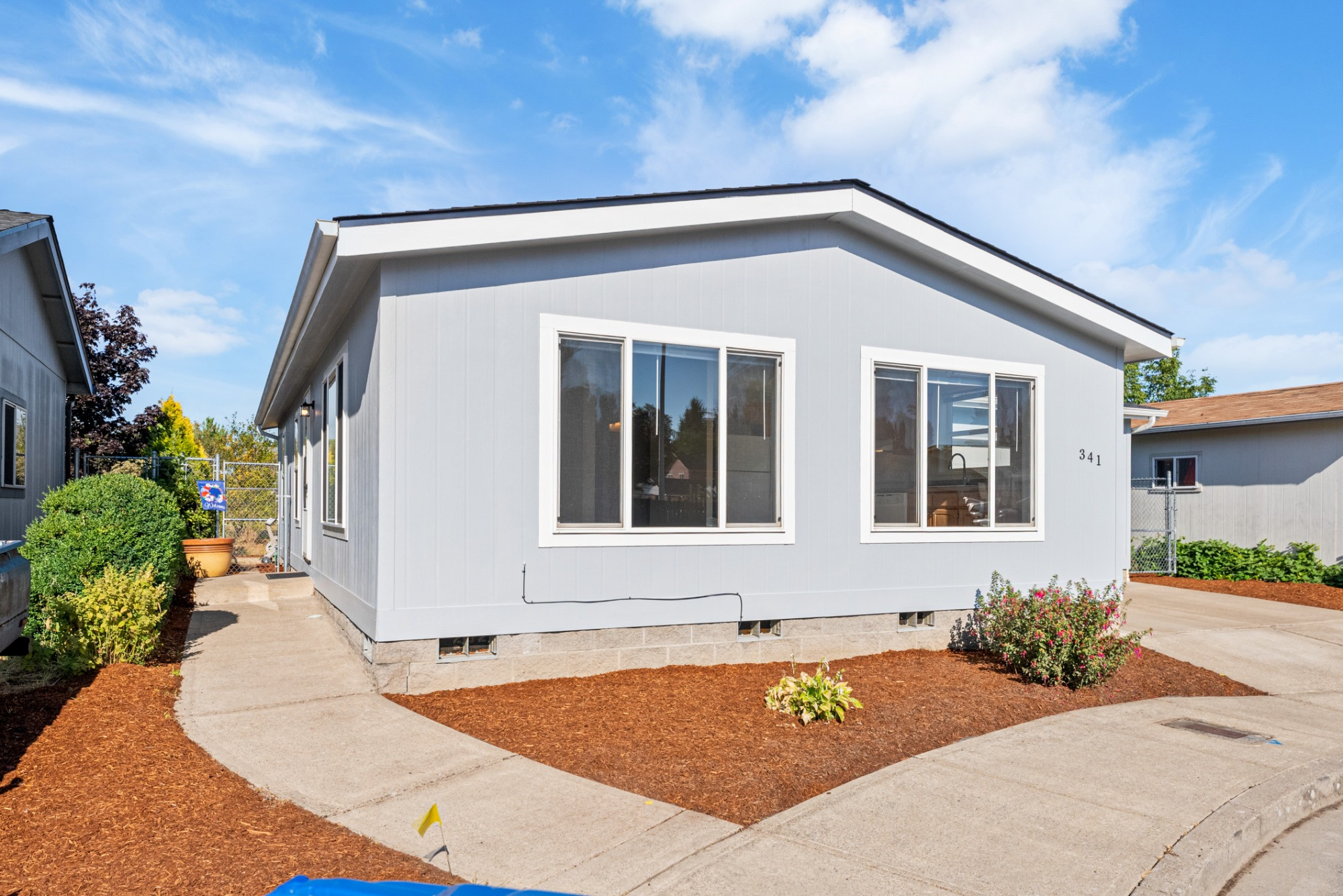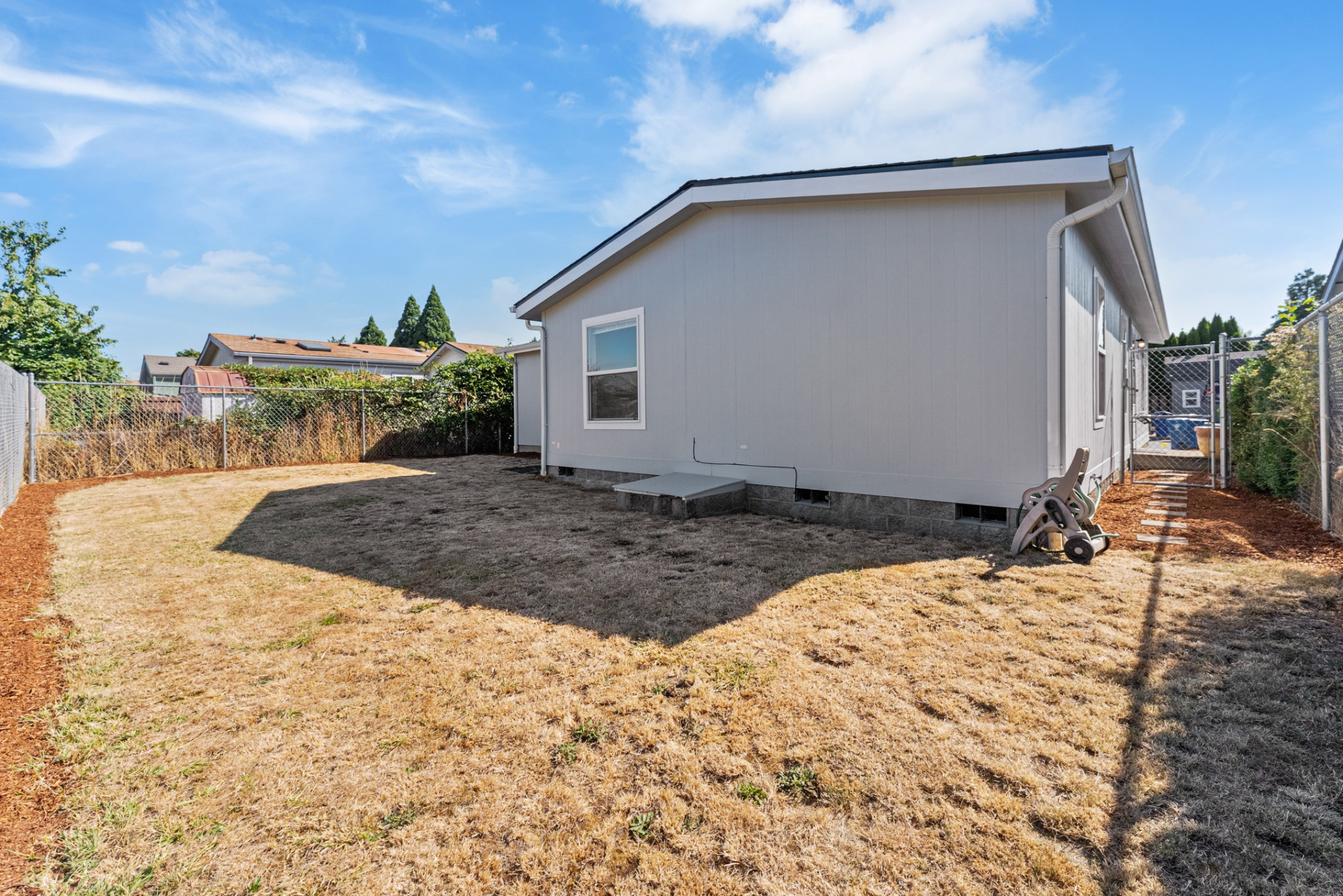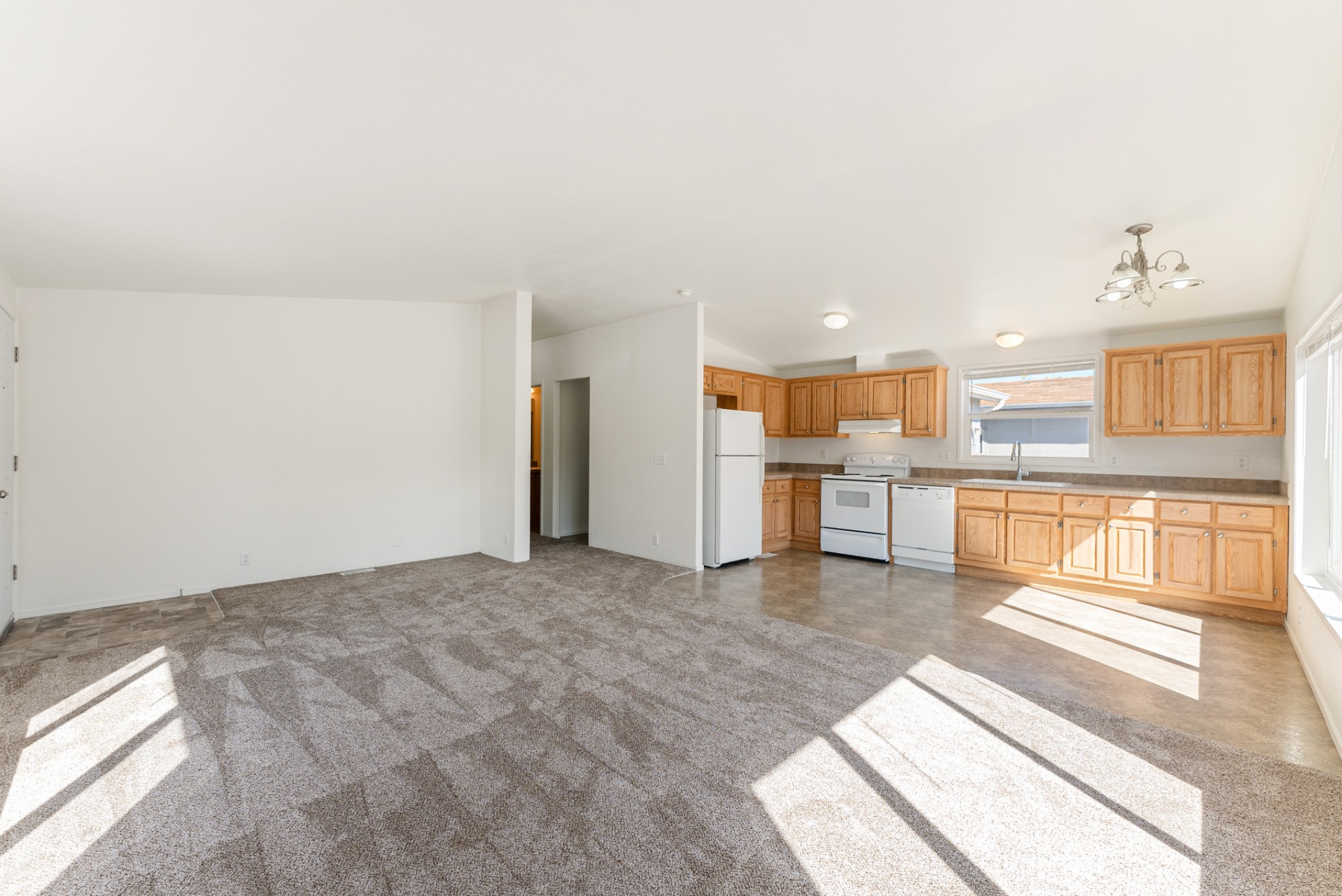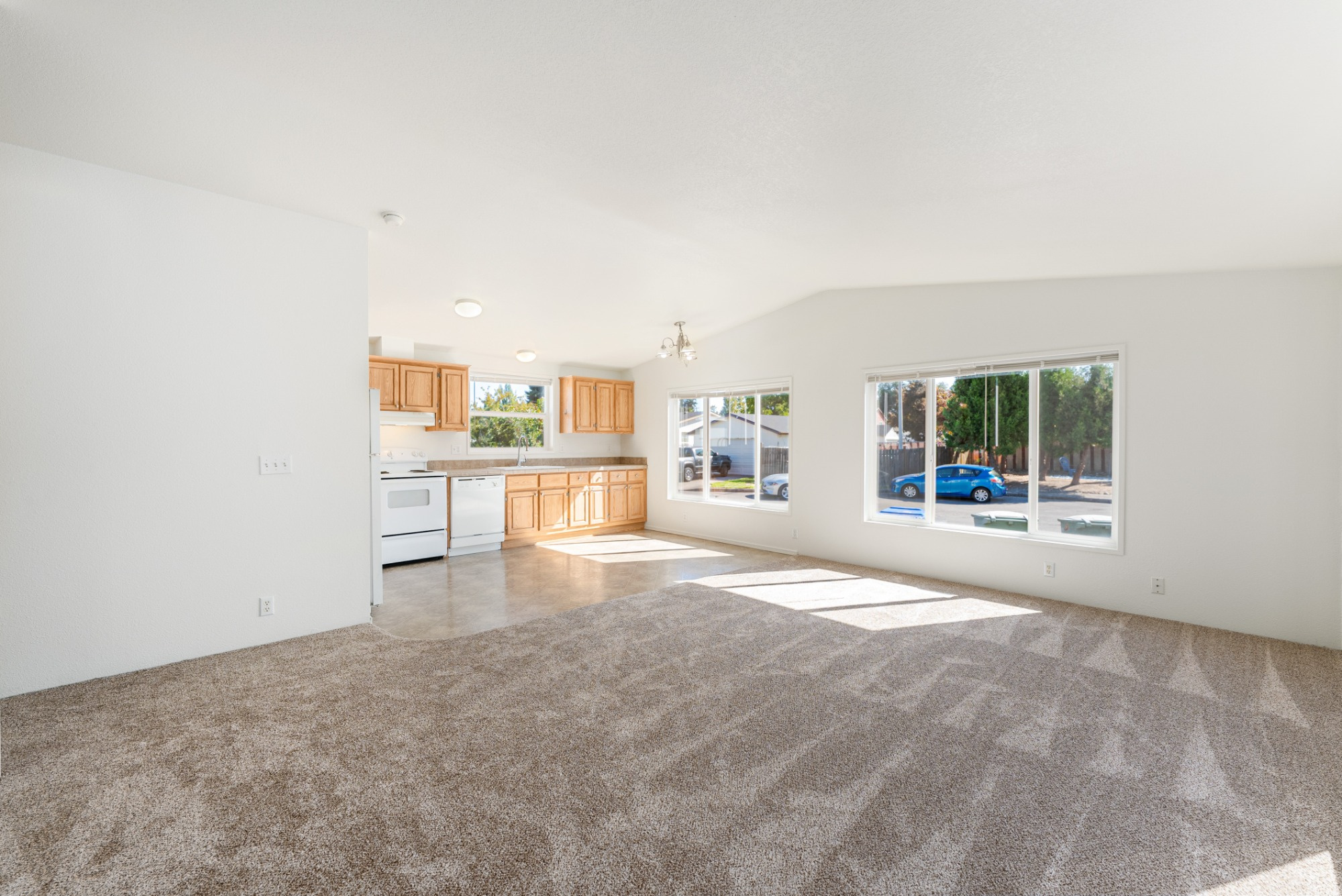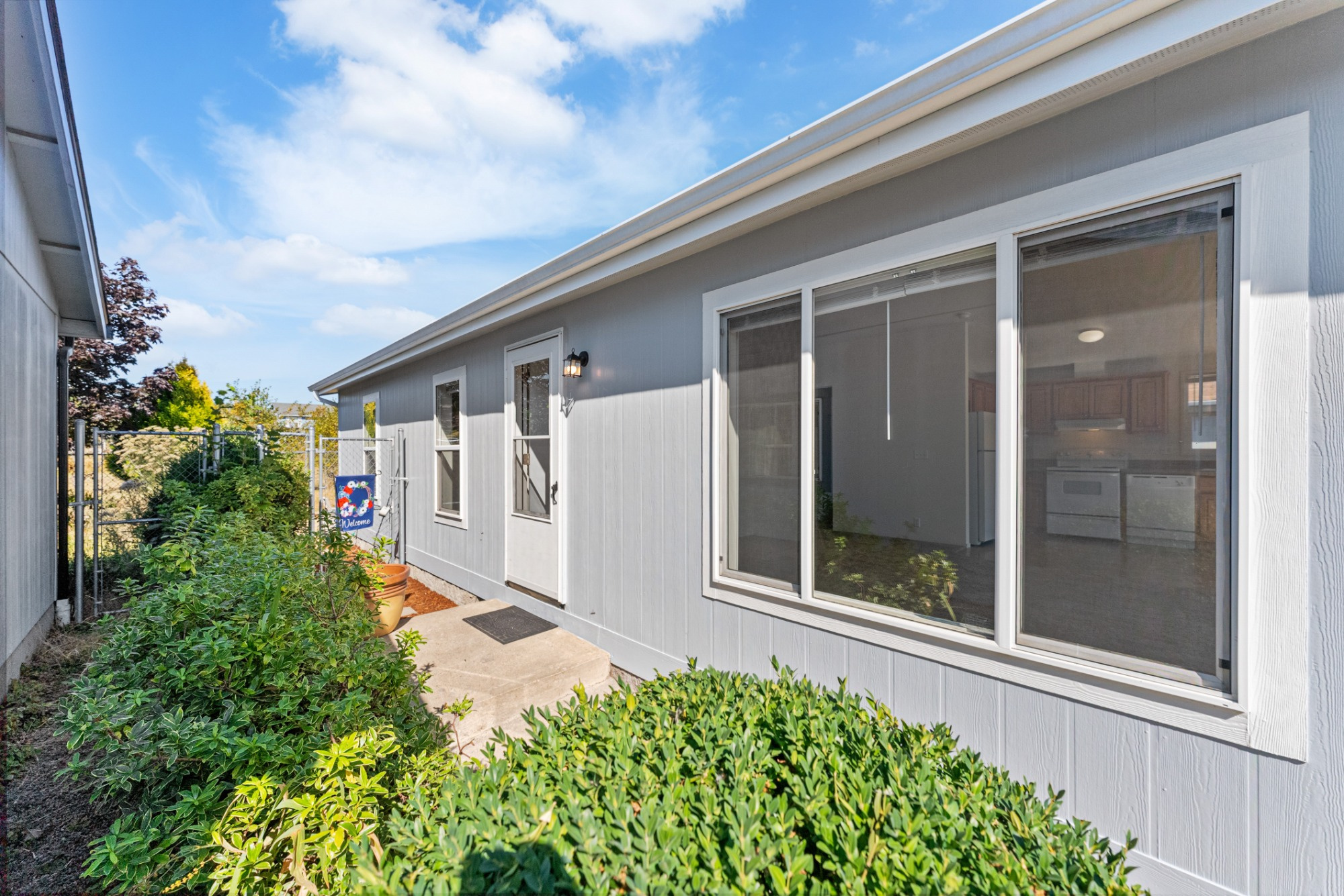 Welcome to easy living! This move-in ready, single-level home sits on a quiet cul-de-sac with a brand new roof and offers a comfortable, low-maintenance lifestyle on land you own. Inside, the great room layout with vaulted ceilings creates an open and airy feel, blending the living, dining, and kitchen areas seamlessly. The kitchen features classic oak cabinets with plenty of storage, and all appliances—including a brand new washer and dryer—are included. The home offers two bedrooms and two full bathrooms. The spacious primary suite includes an attached ensuite with a walk-in shower for added convenience. Fresh new carpet throughout adds warmth and makes the home feel move-in ready. Outside, a fully fenced yard provides space for gardening, pets, or relaxation. An attached single car garage offers secure parking and extra storage. With its updated features and easy-care yard, this home is designed for comfort and simplicity.