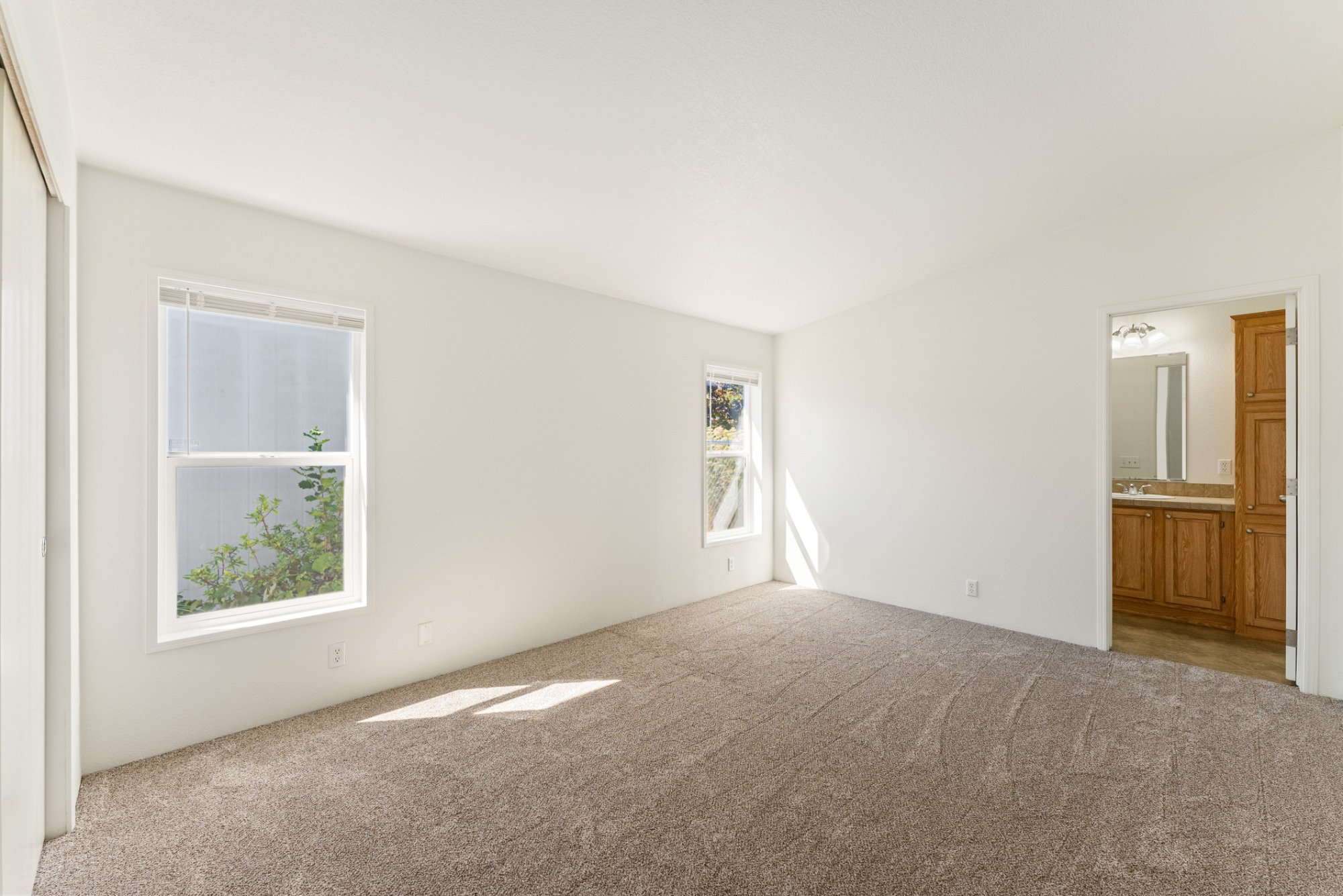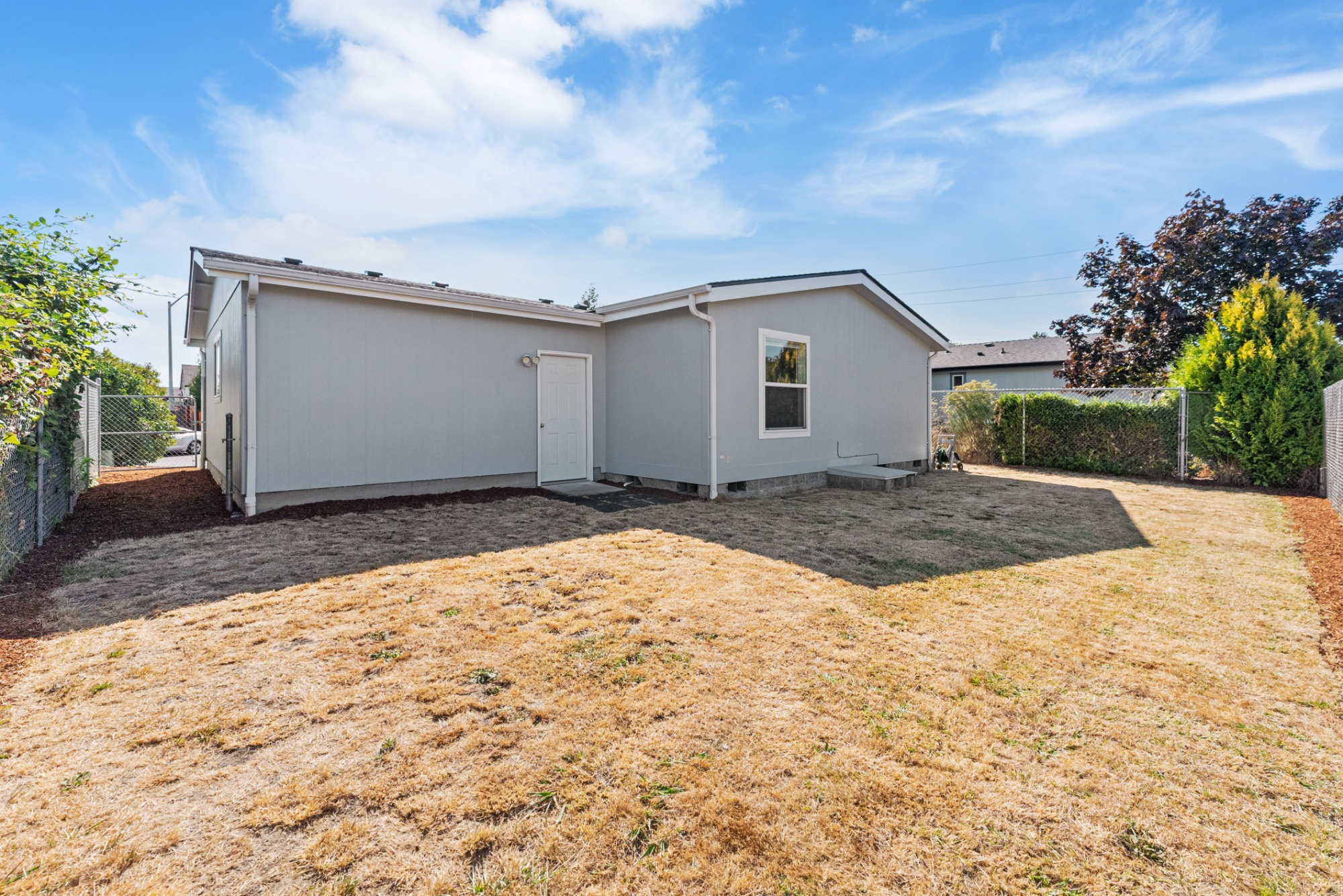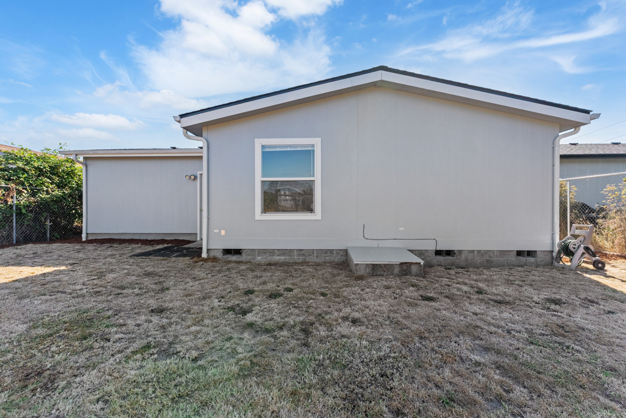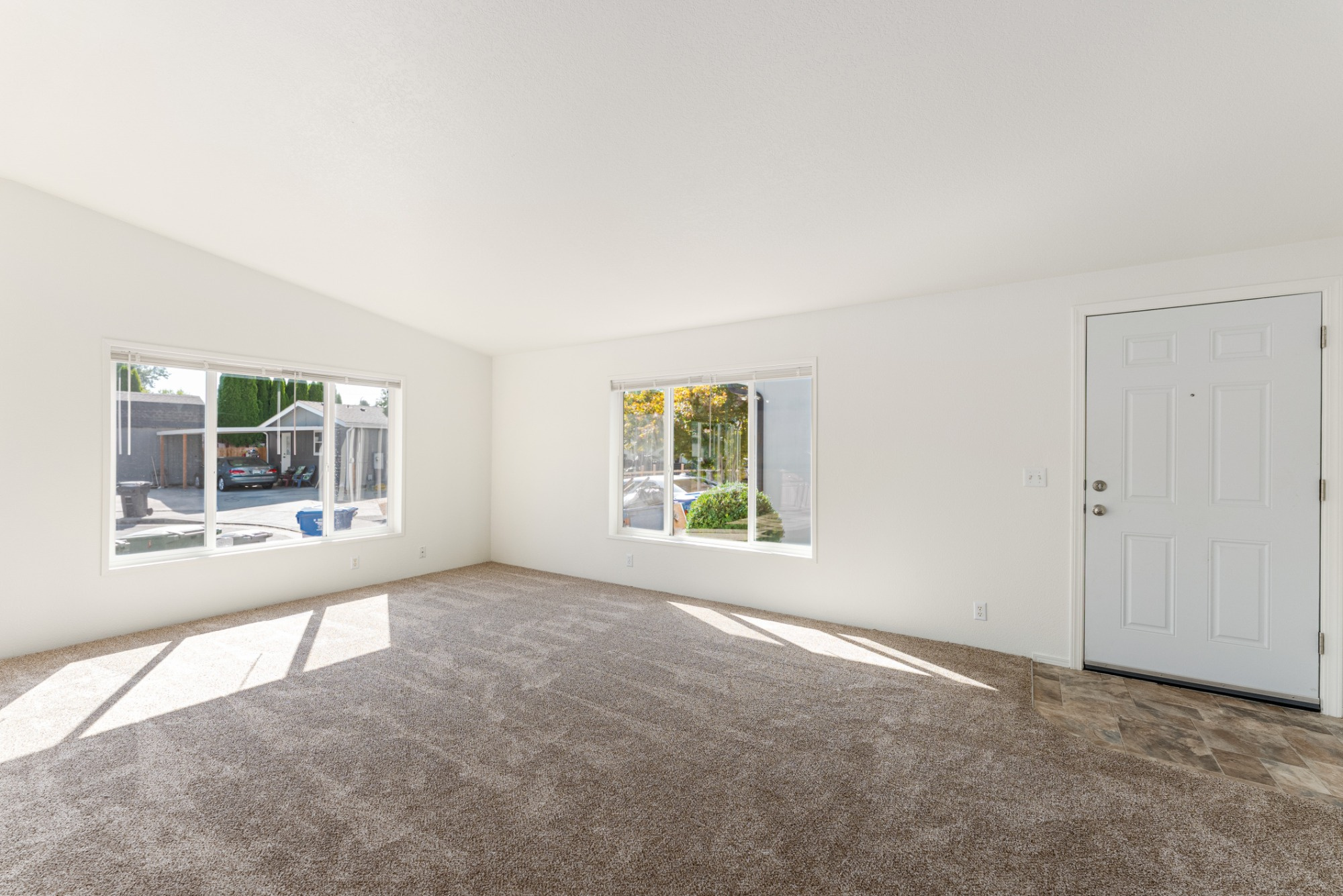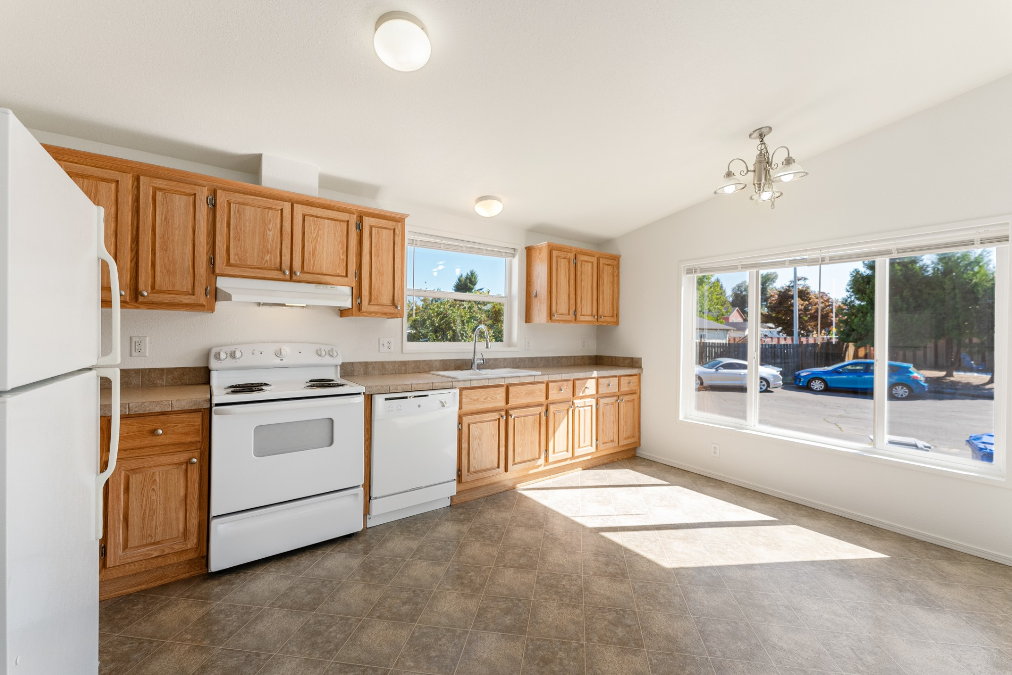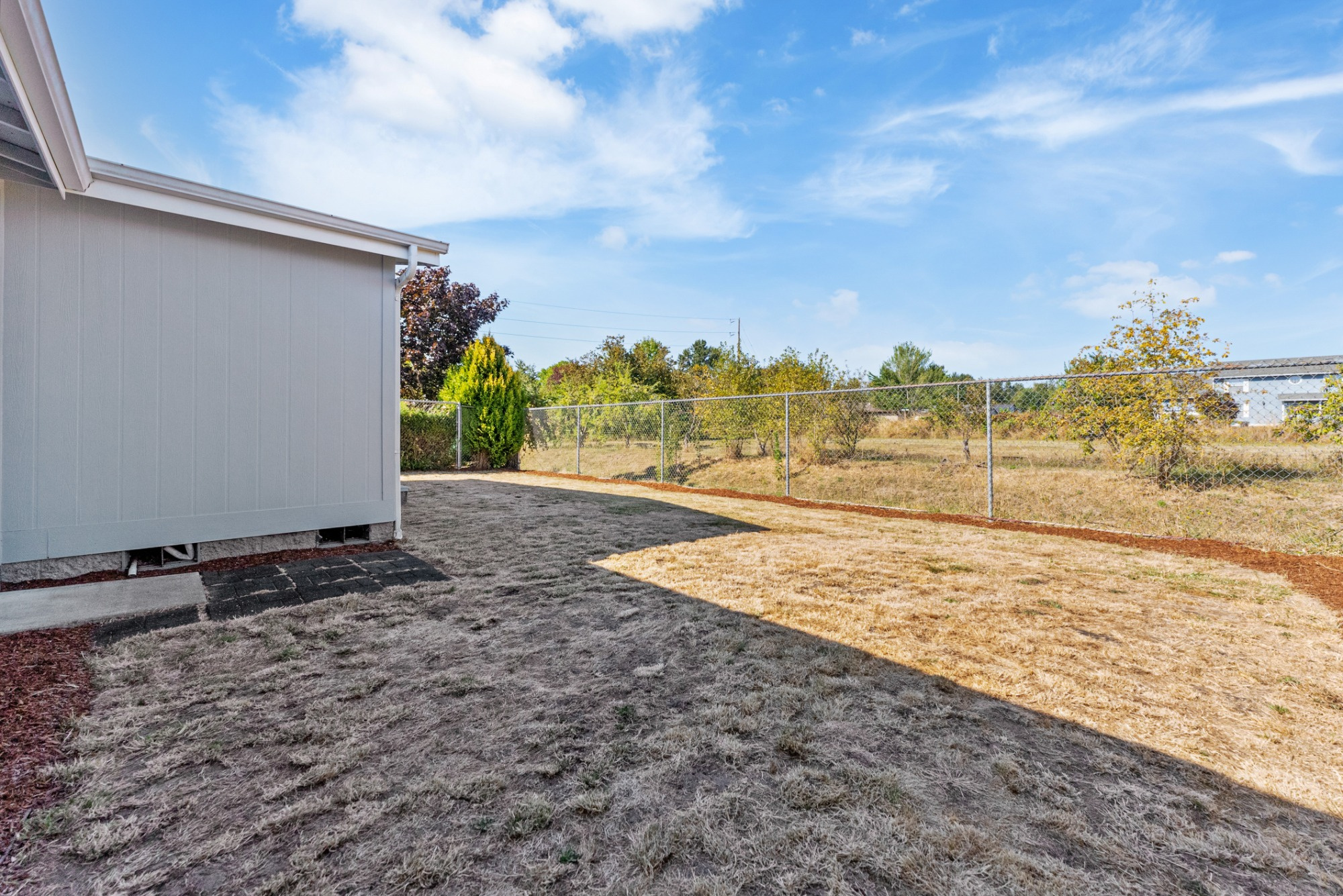 Welcome to easy living! This move-in ready, single-level home sits on a quiet cul-de-sac with a brand new roof and offers a comfortable, low-maintenance lifestyle on land you own. Inside, the great room layout with vaulted ceilings creates an open and airy feel, blending the living, dining, and kitchen areas seamlessly. The kitchen features classic oak cabinets with plenty of storage, and all appliances—including a brand new washer and dryer—are included. The home offers two bedrooms and two full bathrooms. The spacious primary suite includes an attached ensuite with a walk-in shower for added convenience. Fresh new carpet throughout adds warmth and makes the home feel move-in ready. Outside, a fully fenced yard provides space for gardening, pets, or relaxation. An attached single car garage offers secure parking and extra storage. With its updated features and easy-care yard, this home is designed for comfort and simplicity.