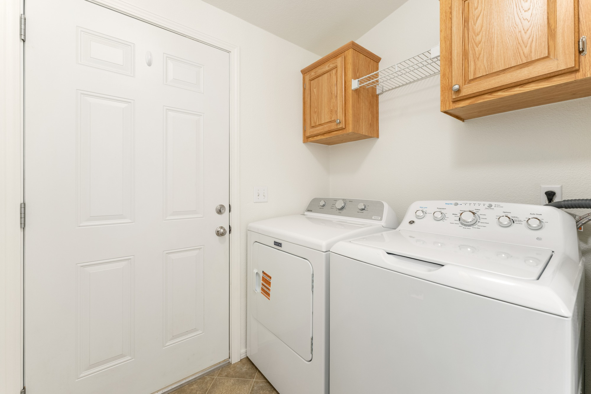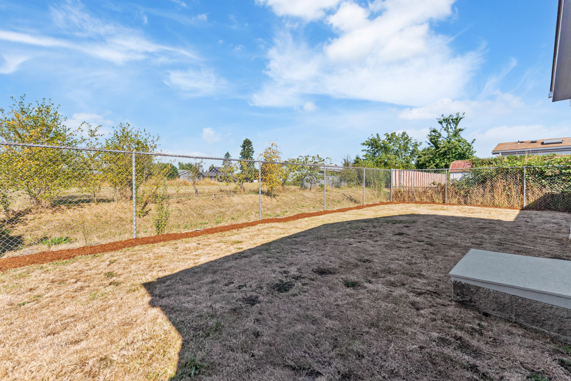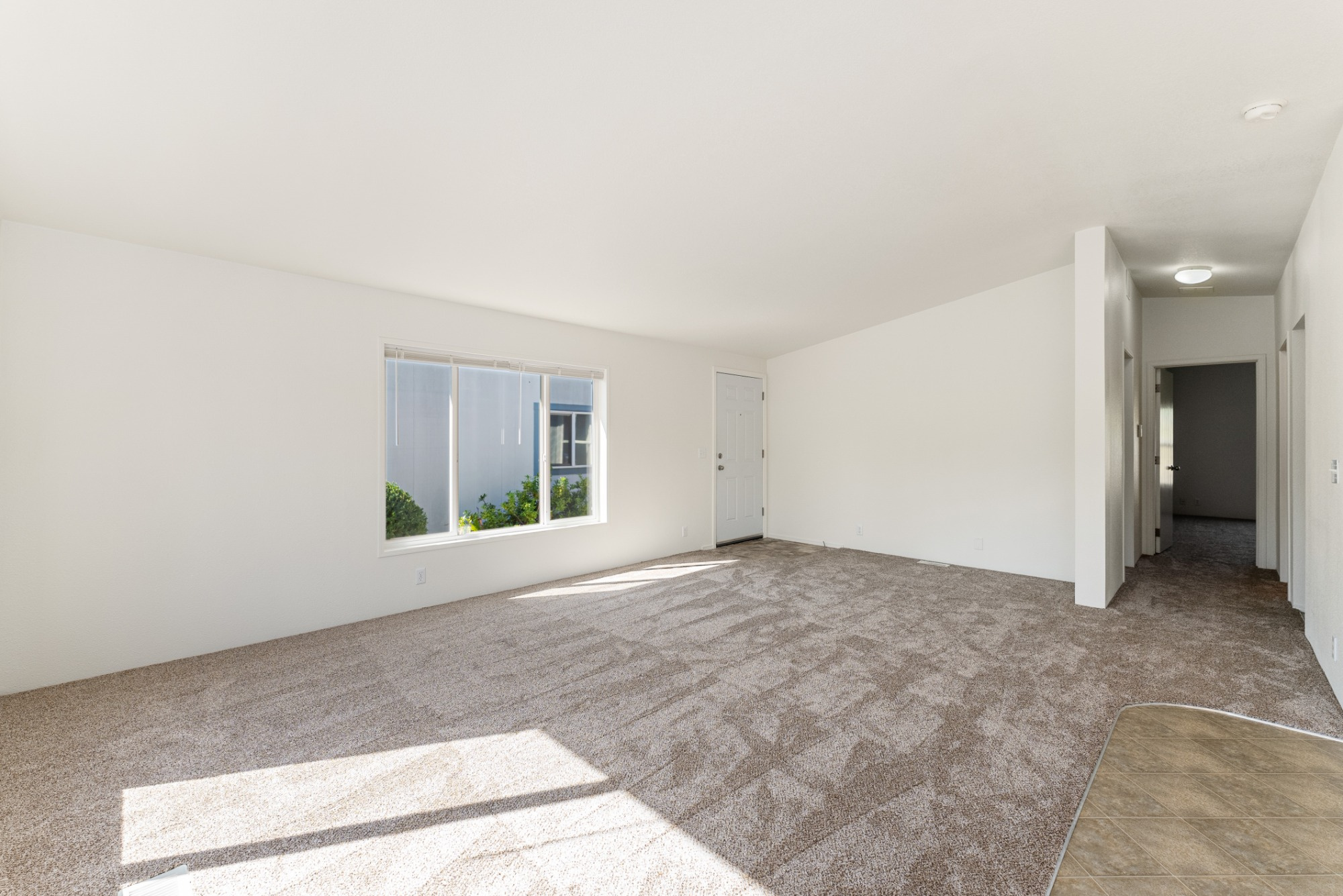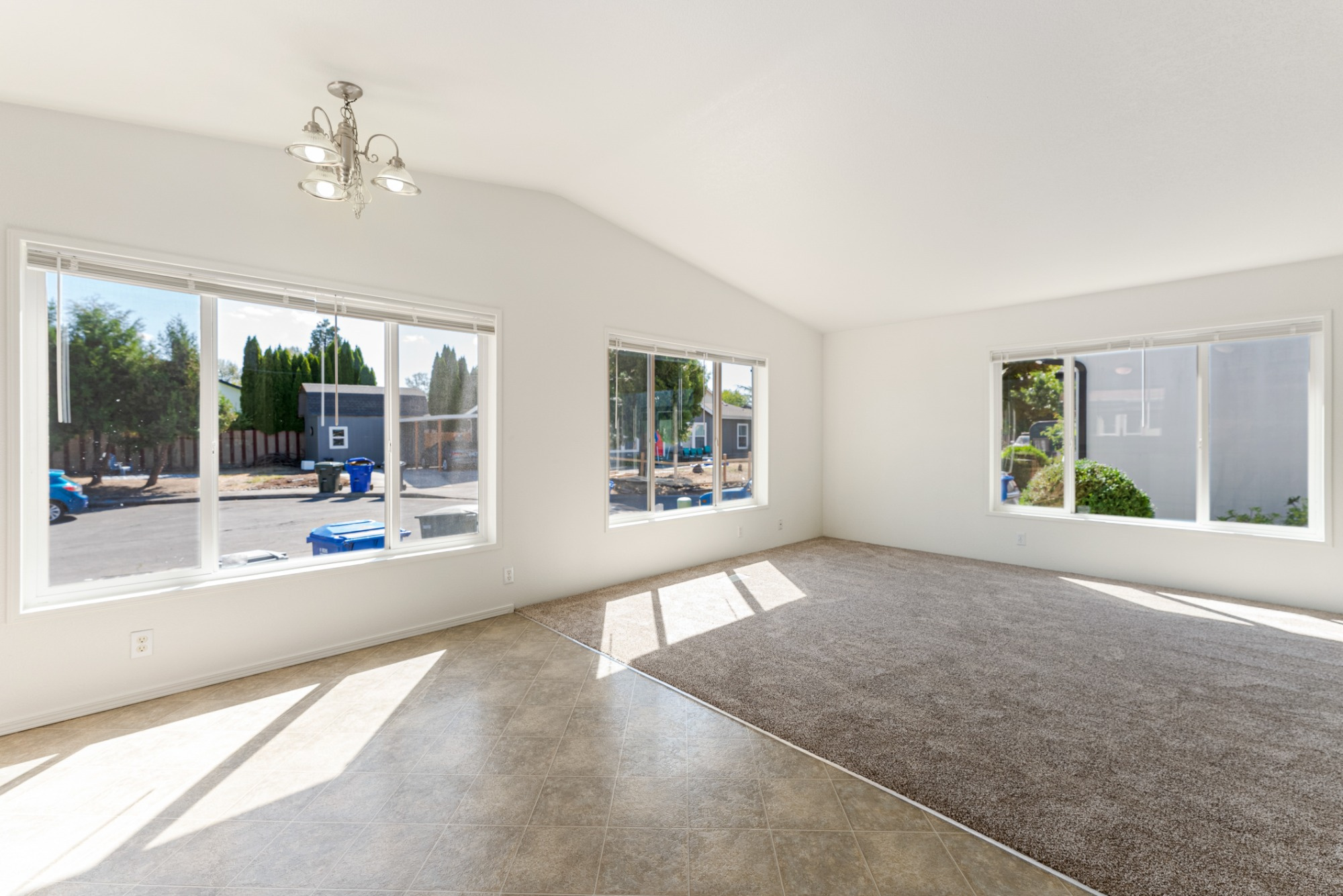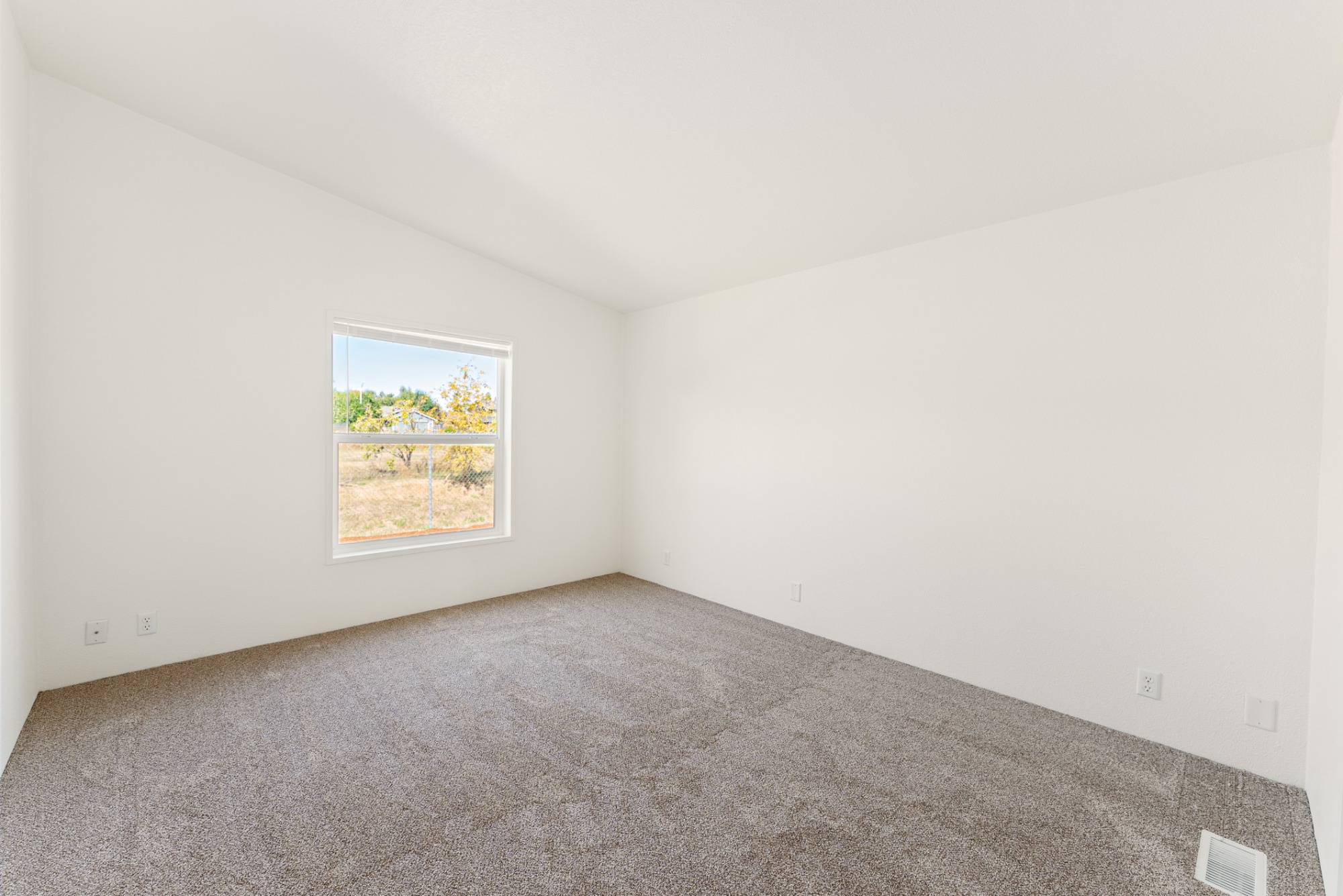 Welcome to easy living! This move-in ready, single-level home sits on a quiet cul-de-sac with a brand new roof and offers a comfortable, low-maintenance lifestyle on land you own. Inside, the great room layout with vaulted ceilings creates an open and airy feel, blending the living, dining, and kitchen areas seamlessly. The kitchen features classic oak cabinets with plenty of storage, and all appliances—including a brand new washer and dryer—are included. The home offers two bedrooms and two full bathrooms. The spacious primary suite includes an attached ensuite with a walk-in shower for added convenience. Fresh new carpet throughout adds warmth and makes the home feel move-in ready. Outside, a fully fenced yard provides space for gardening, pets, or relaxation. An attached single car garage offers secure parking and extra storage. With its updated features and easy-care yard, this home is designed for comfort and simplicity.